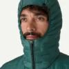 Center-front zipper has a storm flap for warmth and a zipper garage at the chin for next-to-skin comfort; hoody is patterned for high mobility, with a backpack- and harness-compatible fit