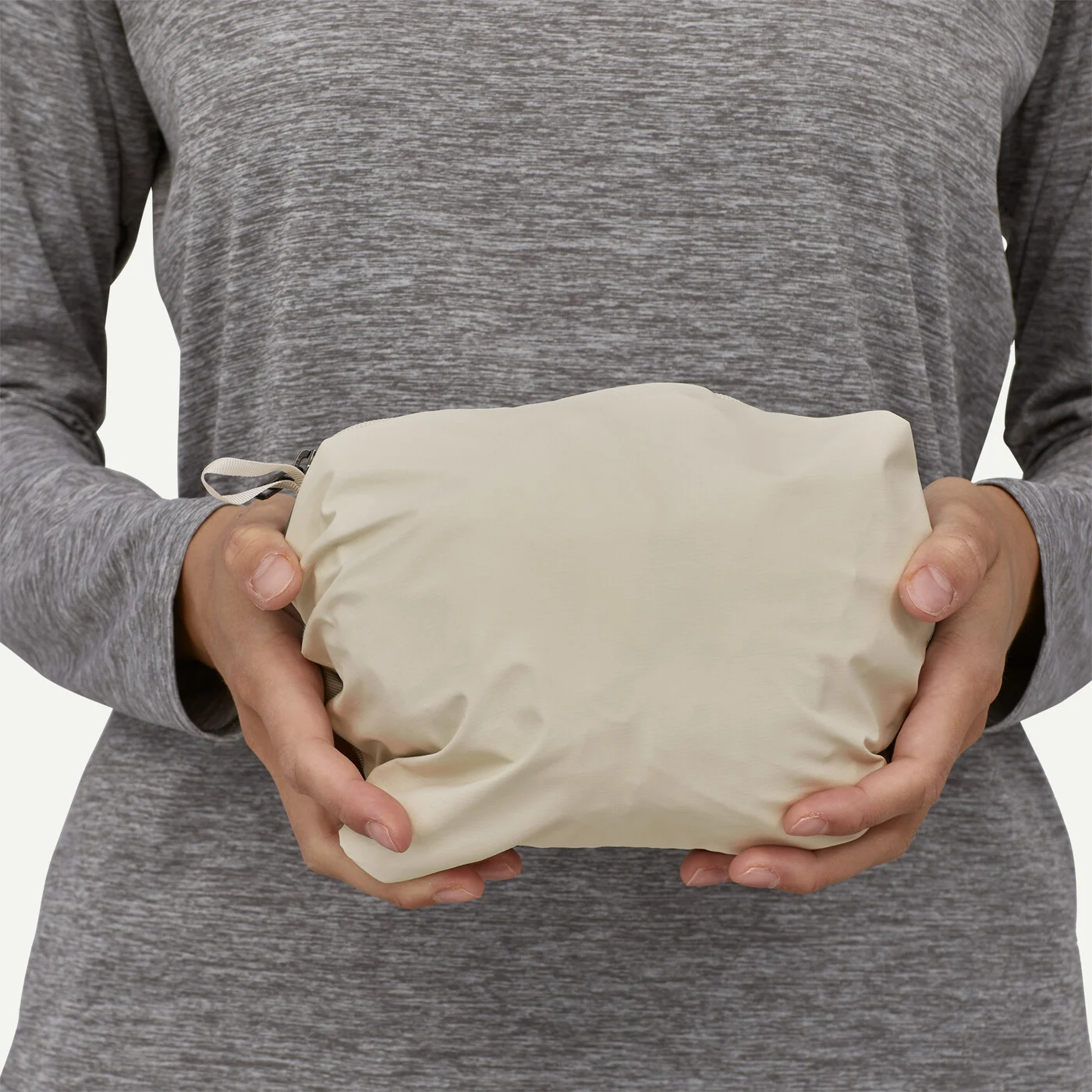 Two handwarmer pockets and venting pit zips with welted exterior storm flaps; the jacket self-stuffs into the left handwarmer pocket with a carabiner clip-in loop