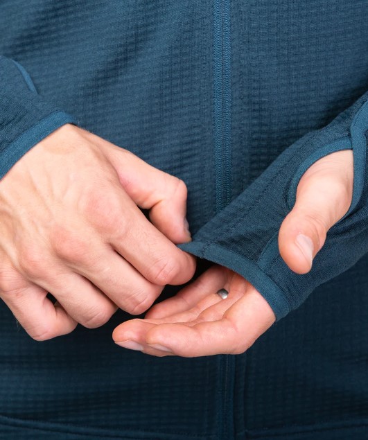 Διαθέτει επίσης κεντρικό μπροστινό φερμουάρ και μανσέτα από ελαστάν με κρυφές θηλιές για τον αντίχειρα.