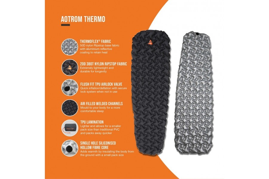Νέο στρώμα ύπνου Vango Aotrom Thermo Trek έχει προηγμένες ιδιότητες ζεστασιάς με το νέο ύφασμα ThermoFlex® με ανακλαστική επίστρωση αλουμινίου, που διατηρεί τη θερμότητα και σας προστατεύει από το κρύο.