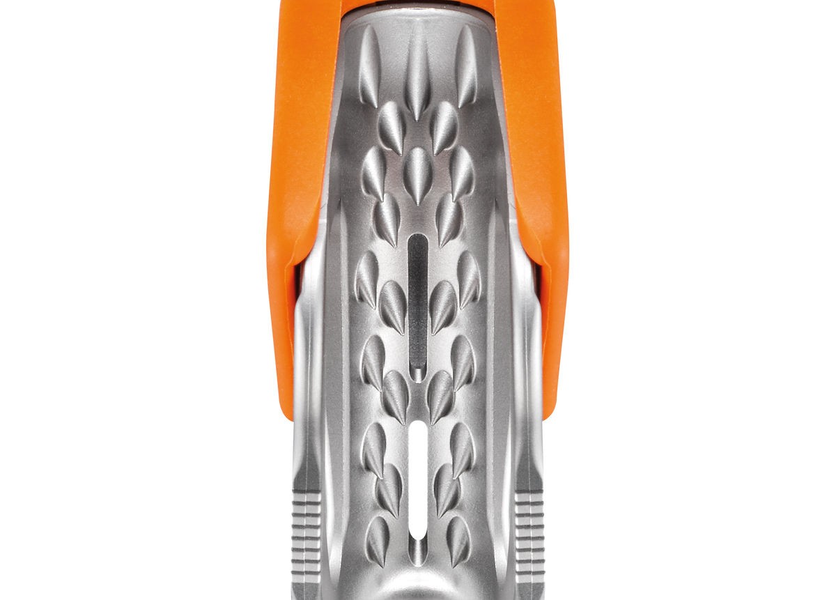 Το TIBLOC διαθέτει ένα αυτόματο σύστημα που πιέζει το καραμπίνερ στο σχοινί για να ξεκινήσει η πέδηση στο σχοινί.